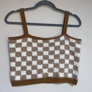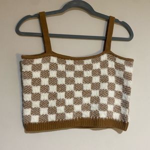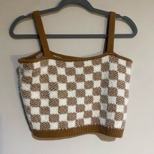 Hazel Moon Brown Cream Checkered Fuzzy Soft Cami Crop Top Size Medium