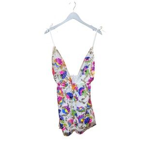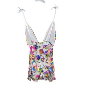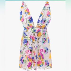 Bold, sparkly, and party-ready. Features multicolor floral sequins on white mesh, a plunging v-neckline, ribbon tie straps, and full lining for comfort. NWOT, excellent condition.