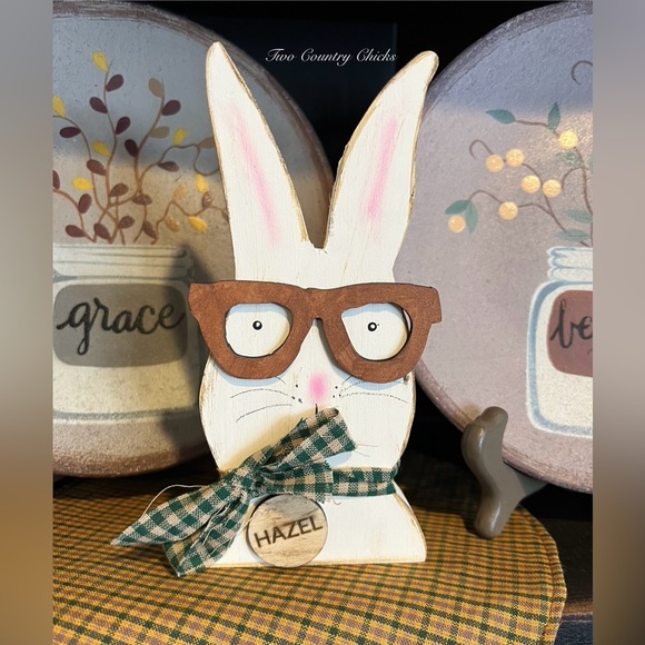 Sweet Hazel is a smart looking country rabbit with her wood spectacles, homespun fabric tie and wood name tag. Hand cut and painted, She is slightly distressed solid wood and measures approximately 6.5”h
