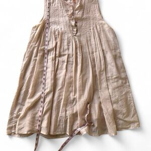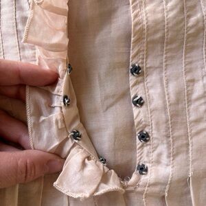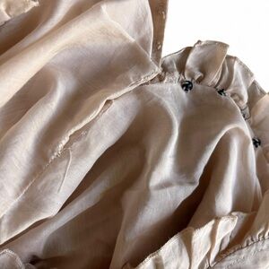 Chic creamy pink baby-doll with ruffled neckline. Stylish and versatile. Some loose threads including around the front snaps. I mended the hole. The dress is a cotton/silk blend