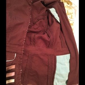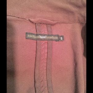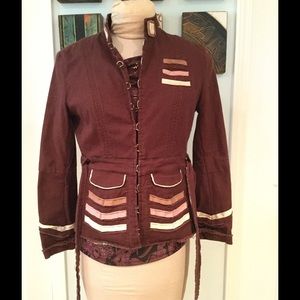 Unique Hazel Jacket. Has rough edges all over and fun detail. Does have a white mark on the left sleeve as pictured. Hard to tell but it is a chocolate brown color. Size Small.