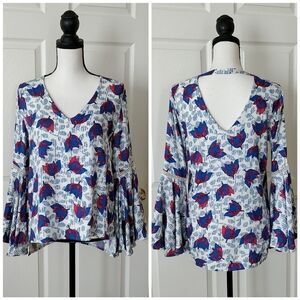 Brand new Hazel double v-neck bell sleeves blouse sz S, floral pattern, super soft material, high/low style, split sides, off-white base with blue/red flowers. No holes, no stains, no pilling, NWT.