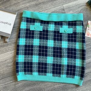 Hazel moon cardigan sweater and knit skirt set in teal/navy. Size L NWT!