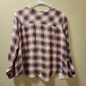 Hazel plaid blouse with lace on the shoulder. Pink and black, size small.