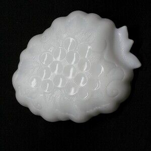 Opaque milk glass dish shaped and embossed like a bunch of grapes, made by Hazel-Atlas. Vintage from the 1960s. Originally manufactured to be a snack plate. Would make an awesome soap dish, candy dish, trinket tray, jewelry dish. Perhaps even great to serve fruit or dessert on.... so many ways to use this vintage piece. In excellent used condition, piece has no chips or cracks. Approx measurements are 7" × 5 1/2", and 3/4" deep.