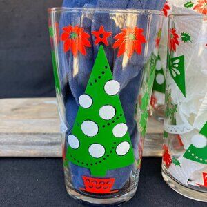 Vintage MCM Hazel Atlas Hazelware Merry Christmas Happy New Year Tumblers - Set of 4. Festive holiday tumblers. A little over 11 oz. These glasses do double duty featuring ‘Merry Christmas’ in a wreath on one side and ‘Happy New Year’ in a bell on the other. Colorful holiday graphics of bows, poinsettias, a decorated christmas trees, bells and wreath. Graphics are glossy green, red and white. 5 1/8” high. Very good vintage condition. Look unused. Great graphics - glossy and strong with minimal wear and fleabites.