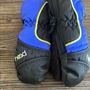 Stylish mittens in black and blue with lime accents. Features a convenient zipper closure.\