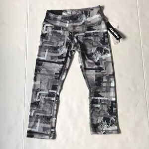 black and grays in a geometric pattern dri motion moisture manage. Moisture wicking fabric. Mid rise body hugging fitted