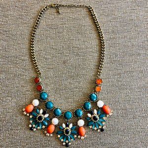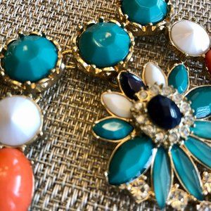 Turn heads with this beautiful jade and coral colored stones statement piece accented with some navy blue and white stones along with cubic zirconia accents, gold chain. In great condition, gently used. There is one connector missing (see the close up picture) but it doesn't affect the look of the necklace when worn. Was difficult to get the lighting to capture the color of the chain, but it looks a lot darker in this photo than in person. 19" with 3" extender.