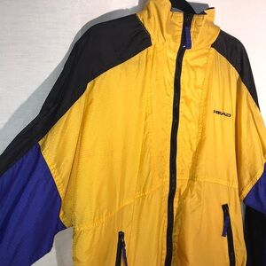 Super Litty, vintage windbreaker by “Head”. Lakers color-way on deck with the yellow, purple, and black. Elastic drawstring at the bottom & a pack away hood is in the collar. There are a few small stains- a small, blue one at the collar & some slight discoloration at the top left (see pics) Honestly, this piece is still in great shape and has many more wears left in it 😘