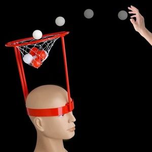 Headband hoop game, is a riot to play! Place the Basket Case headband hoop game on your head, then see how many balls you can toss inside. Makes great fun at company picnics - order two and have fun competitions among picnic-goers. Also fun in parades, or as a walk around. Goofy, addictive fun. Play alone or with a friend, but watch out for those slam dunks. Head strap is adjustable with Velcro. Red plastic with nylon netting. Hoop is 11" x 9 1/2" diameter. Includes 20 balls: 10 white and 10 red
