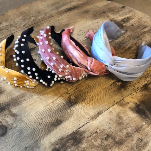 Barely worn pack of headbands. 3 are velvet material with pearl beads sown in. 1 is tye-dyed pink and white. 1 is light blue.