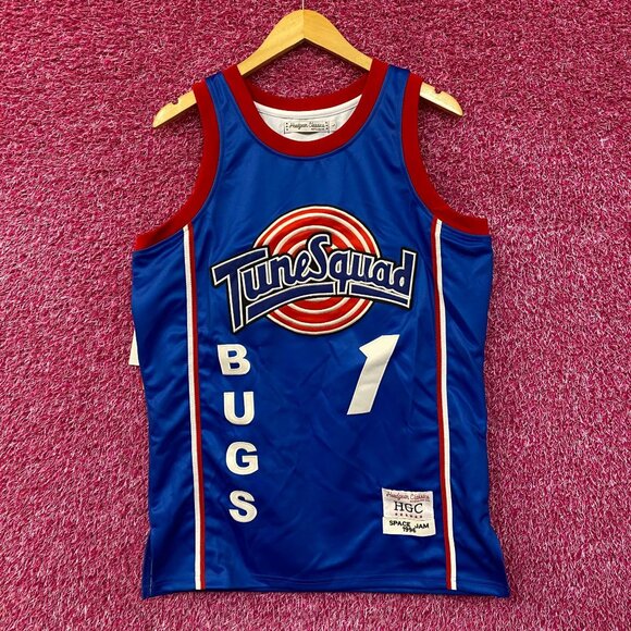 Headgear Classics Bugs Bunny Tune Squad Space Jam Basketball Jersey Large. Generally measures 21 inches pit to pit and 30 inches long. Amazing jersey featuring "BUGS" on the back and the number "1" on both the front and back, representing Bugs Bunny on the Tune Squad team. New never worn and in great condition.