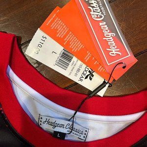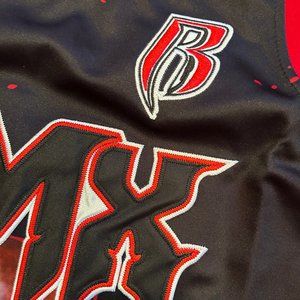 Brand new with tags. MSRP$110.00. This woven polyester jersey features sublimated graphics on front and back. Sewn-on tackle twill embroidered logos featuring DMX and Ruff Ryders logos on front. Embroidered song lyrics on back. Ribbed collar and arm openings and split seam side hems. Sewn-on embroidered jock tags with HGC logo and "DMX 1998" graphics. Black and Red with multi-color graphics. Men's size Large.