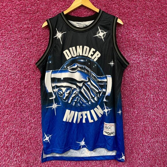 Headgear Classics Dunder Mifflin Basketball Jersey XL. Generally measures 22 inches pit to pit and 30 inches long. Amazing jersey featuring an image of a handshake with " Dunder Mifflin" around. New never worn and in great condition.