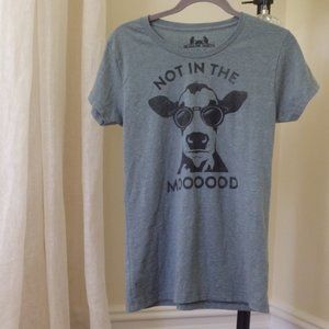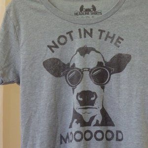 Headline Shirts Graphic Tee showing cow wearing sunglasses - written words: Not in the Moooood". Size L women's top.