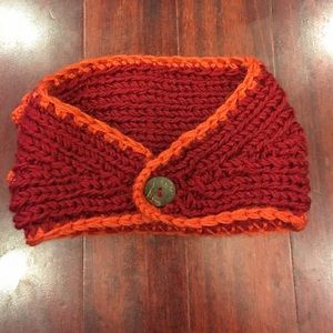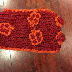 This headscarf is made with yarn. It has 2 flowers and three butterflies on it. The flowers have the beads in the middle. This scarf has never been worn
