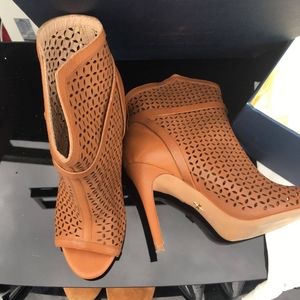 Size 9, Pour la Victoire, Brown Heals, open toe boots. Surprisingly comfortable, like new condition