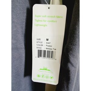 This is a Healing Hands Melissa Top in size M for women, designed for yoga and workouts. The top features a solid pewter color with a round neckline, long sleeves, and a pullover closure. Made from a blend of cotton, polyester, and spandex, it offers a body compression fit and is machine washable. Ideal for activewear, this pullover style top is suitable for all seasons.