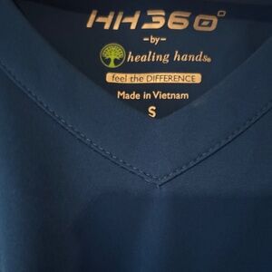 Electric Blue scrub set by Healing Hands. Soft and durable fabric, so stretchy and comfy. Lots of pockets and bottom has button closure to make them flare or not, your choice. Small stain on the bottom’s pictured in picture #5, totally not noticeable when wearing them but I wanted to mention it.