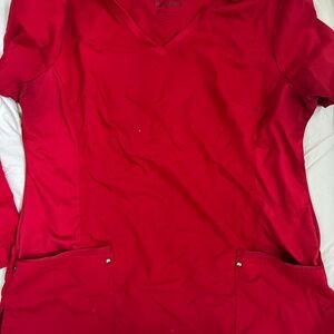 These are my personal scrubs - Healing Hands Purple Label XL. This is a set of two tops and one pair of pants. They are identical in color - a very nice red. No notable flaws. Wrinkles from being in my closet.