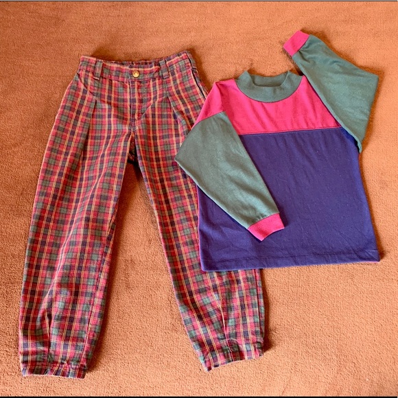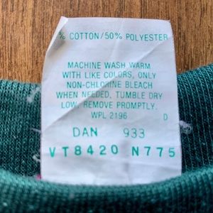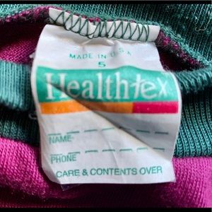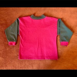 Healthtex color block tee has a crew neck and long sleeves. Colors in the shirt are green, blue and berry color - photos don’t do justice to the berry color.
