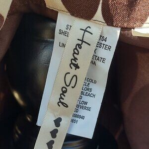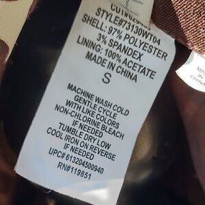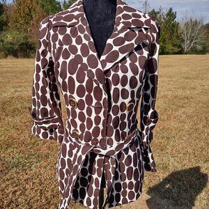 Brown and white jacket with gold and brown accent buttons and a tie waist. Size small.