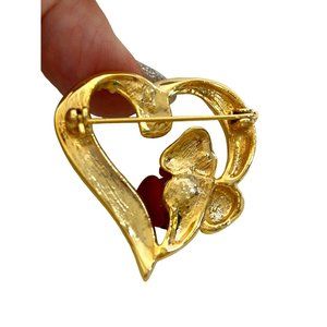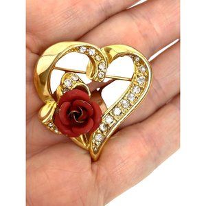 0709A- vintage, shiny, gold tone, women’s heart brooch/pin, 22 clear, round, rhinestones, .5” wide red, ceramic rose, roll tab, arm closure. 1.5” x 1.5”. Excellent condition. Rosr has brushed gold highlighting at tips of petals. Lovingly preowned. Unbranded.