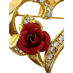 Heart Brooch Pin Gold Tone Red Ceramic Rose Clear Rhinestones Shiny Roll Tab Arm