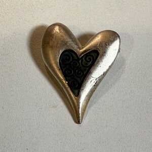 Keywords: heart brooch, silver tone pin, green swirl, vintage jewelry, women's accessory, heart jewelry, brooch pin, fashion brooch, gift for her, romantic jewelry, stylish brooch