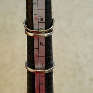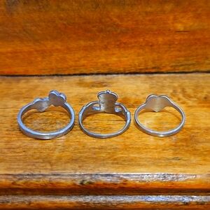 Three small rings in black and silver tone. The Irish Claddaugh ring is marked COP 89 and is a size 5. The others are unmarked and sized 4.75 and 6.75. Fast shipping and careful packaging. (N)