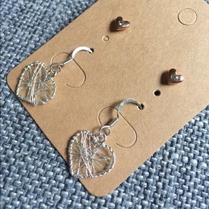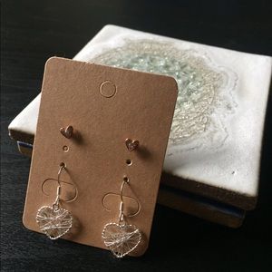 Small rose gold studs with tiny jewels and delicate silver wire drops