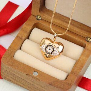 Stylish heart-shaped pendant featuring an evil eye design with black and white stones for protection and charm.