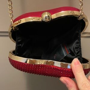 Can be a clutch or has long gold chain shoulder strap.