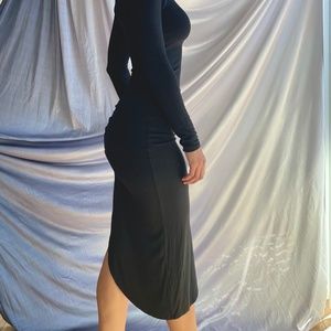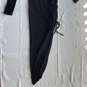 Long sleeve, form-fitting black dress. Asymmetrical drawstring design can be pulled up high on left leg for sexier look. Wear with black combat boots and cropped leather jacket with big jewelry to complete look! Excellent condition, worn twice. Heart & Hips Asymmetrical Long Black Dress, Womens Size Small.