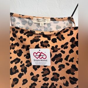 Bold and trendy leopard print crop top by Heart & Hips in size Small. Features a straight neckline, slim black spaghetti straps, and a soft, enzyme-washed fabric for all-day comfort. Perfect for layering or making a statement on its own—pair it with high-waisted jeans or a mini skirt for an effortlessly cool look. In excellent condition.