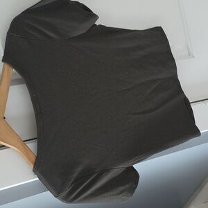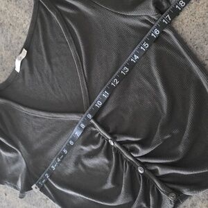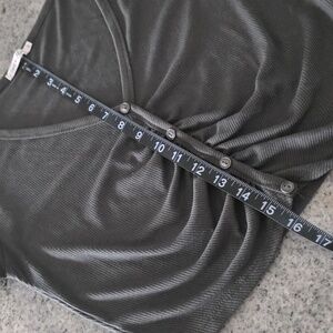 Ribbed crop top with center ruched button detail. Deep V-neck and short sleeves. Simple, versatile olive tone for easy styling.✳️