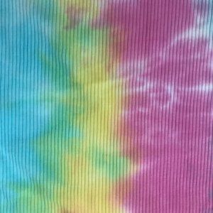 Brighten up your day with this beautiful bodycon mini dress. This dress features wide ribbed texture, medium thickness and lovely and bright cotton candy tie dye color.