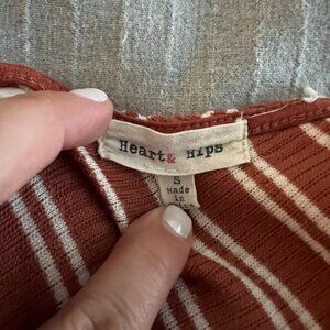 Trendy and cute rust-colored striped crop top by Heart & Hips in size small. This top features a flattering ruched front with an adjustable drawstring and a deep v-neckline, adding a touch of style and versatility. Made from soft, stretchy fabric for a comfortable fit, it’s perfect for casual outings or layering with jackets. Gently worn and in excellent condition.