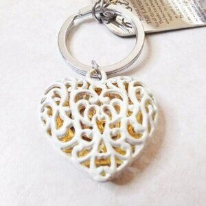 The large engraved key tag is made of stainless steel. I added a big, hand painted white + gold filigree heart [a bit of shabby chic style] and finished it off with a pretty, soft pink lacquered blossom flower charm!