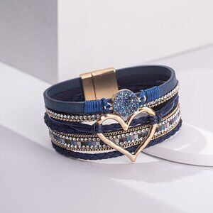 Leather Band Bracelet: The multi strand bracelet is decorated with shinny cubic zirconia, gold heart and blue resin druzy quartz.