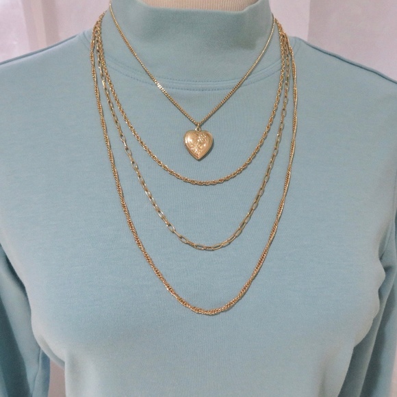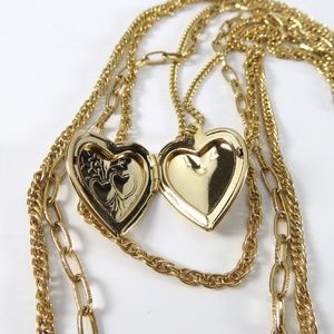 Vintage heart locket necklace with four gold tone chains, from around the 1970’s. Each chain is a different style and length so they drape beautifully. The longest is 28”, the shortest about 17” and the heart 1” high. Nice secure foldover clasp. It’s unsigned and in excellent condition. Also a lovely gift idea.