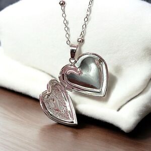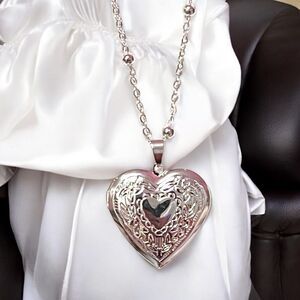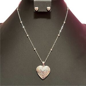 This elegant silver tone heart locket necklace and earring set adds a touch of sophistication to any outfit. Perfect for any occasion.