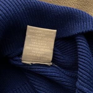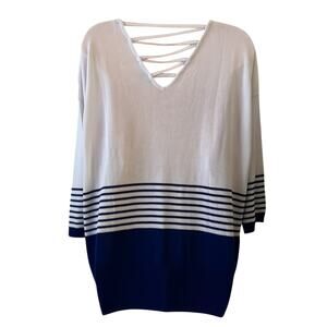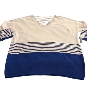 White and royal blue lightweight sweater with 3/4 sleeves and v-neckline front and back (back has cross cross straps )