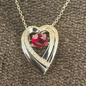 Sterling Silver Heart pendant with inset diamond chips and suspended Ruby. (pictured) 3/4" long x 1/2" wide on 17"-19" adjustable sterling chain.