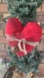 Primitive stuffed heart covered in red felt fabric has a distressed gauze ribbon wrapped around accented by a rusty metal bell. Hangs on a simple string. Measures 7" H x 6-1/2" W.