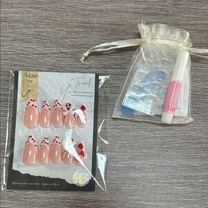 Stylish false nails with a heart pattern. Includes adhesive and application tools.