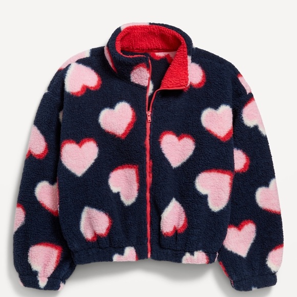 Cozy fleece jacket with a heart pattern. Features a zip-up front and a high collar. Perfect for staying warm and stylish.
