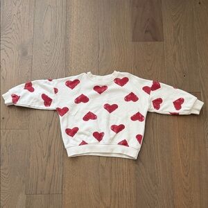 Cozy white sweatshirt featuring a playful red heart pattern. Perfect for casual wear. Says L on tag but fits like a 4/5