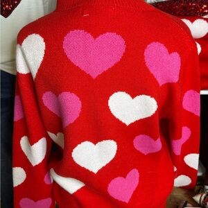 Stay warm and stylish with this vibrant sweater featuring playful heart patterns. A perfect addition to brighten up your wardrobe for Valentines Day